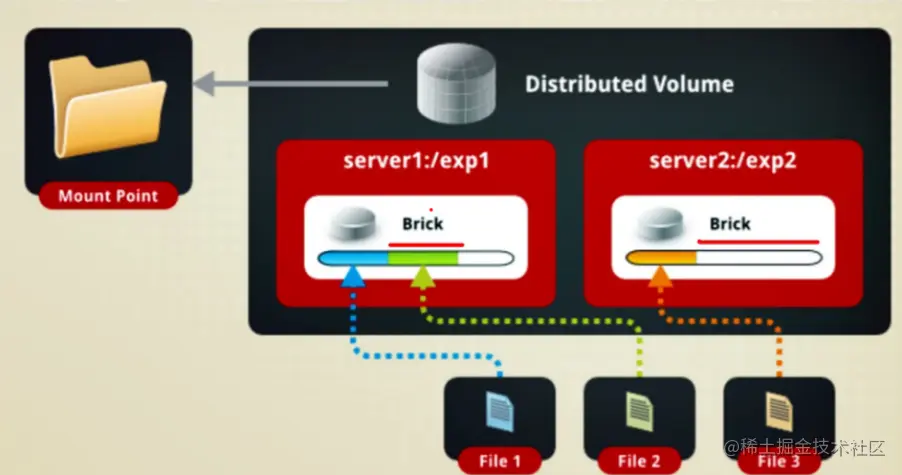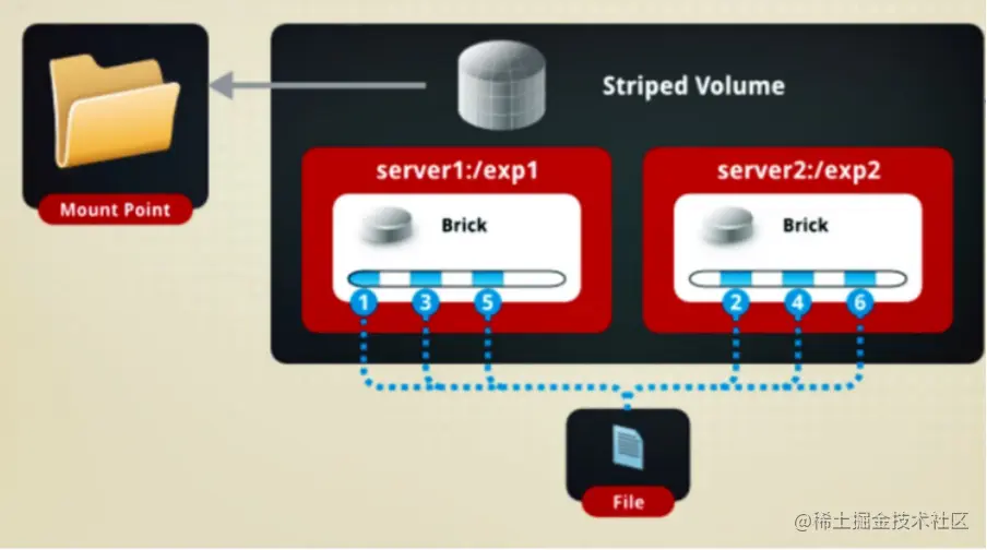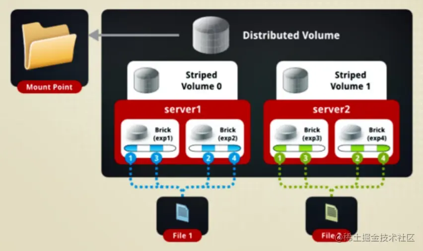 - 根据偏移量将文件分成N块(N个条带节点),轮询的存储在每个Brick Server节点