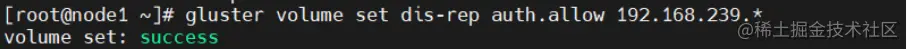 gluster volume set dis-rep auth.allow 192.168.239.* #设置192.168.239.0网段的所有IP地址都能访问dis-rep卷(分布式复制卷)