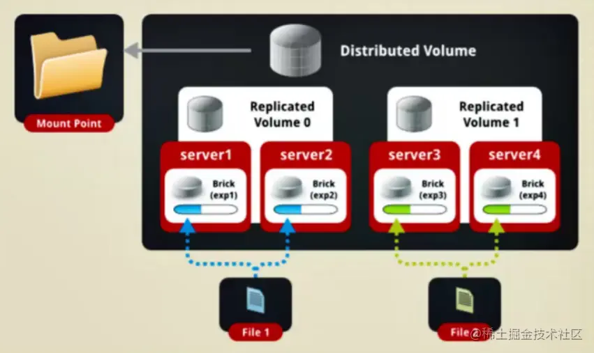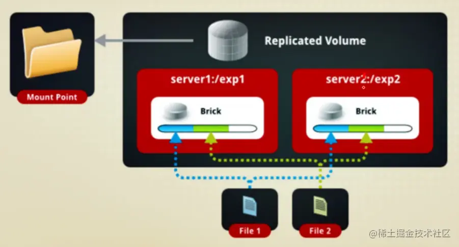 - 将文件同步到多个Brick上,使其具备多个文件副本,属于文件级RAID1,具有容错能力。因为数据分散在多个Brick中,所以读性能得到很大提升,,但写性能下降。