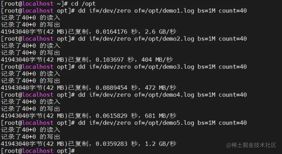 dd if=/dev/zero of=/opt/demo1.log bs=1M count=40