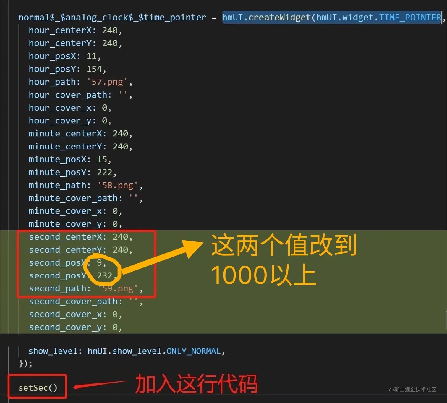 second_posX 和second_posY的值改到1000以上。(这样修改可以避免抬腕时秒针跳动一下的问题,感谢Dex提供的方法 )