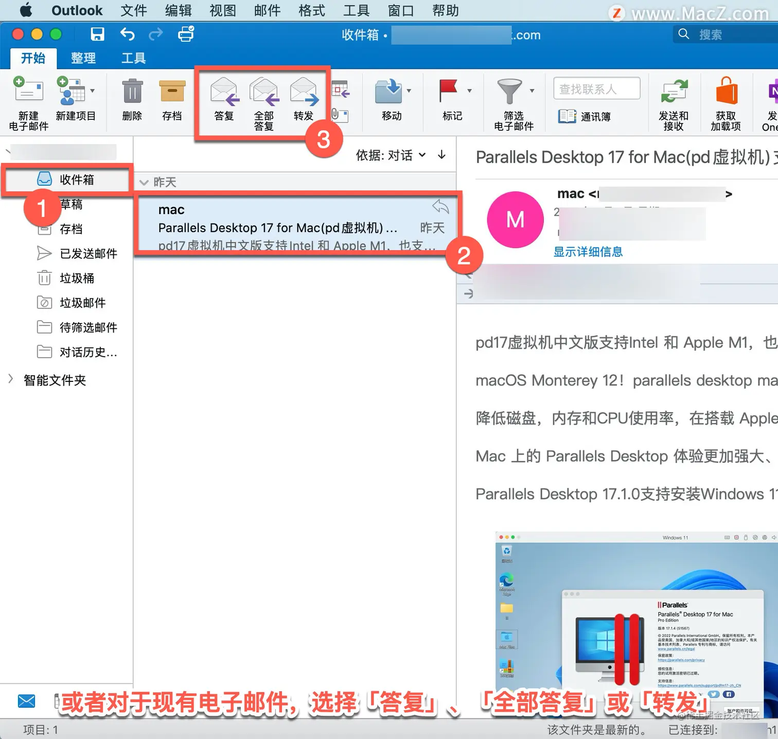 或者对于现有电子邮件,选择「答复」、「全部答复」或「转发」。