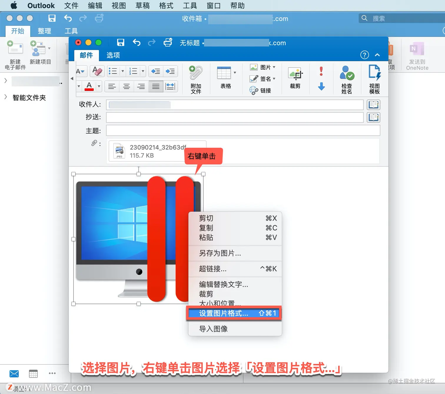 图像显示在邮件正文中,选择图片,右键单击图片选择「设置图片格式...」,以选择工具来根据需要调整图像。
