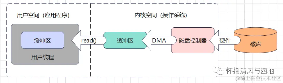 当使用网络IO读取数据时,线程切换上下文进入内核空间,内核通过DMA机制读盘,此时线程挂起,等待内核数据准备就绪。