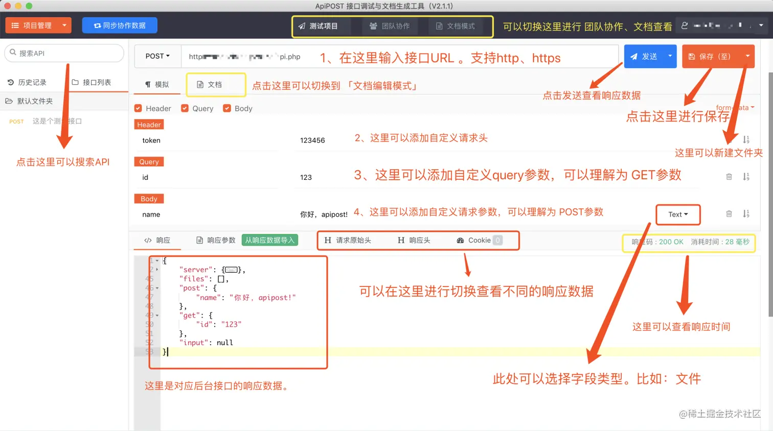 现在的模拟发送请求插件很多比如老外的postman等,但亲测咱们国内的 ApiPost 更好用一些,因为它不仅可以模拟发送get、post、delete、put请求,还可以导出文档,支持团队协作也是它的特色。