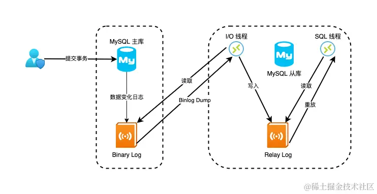 - binlog 的写入:MySQL 主库在收到客户端提交事务的请求后,会先把相关操作写入 Binary Log,然后再提交事务,更新存储引擎中的数据,事务提交完成后,返回给客户端操作成功的响应;
