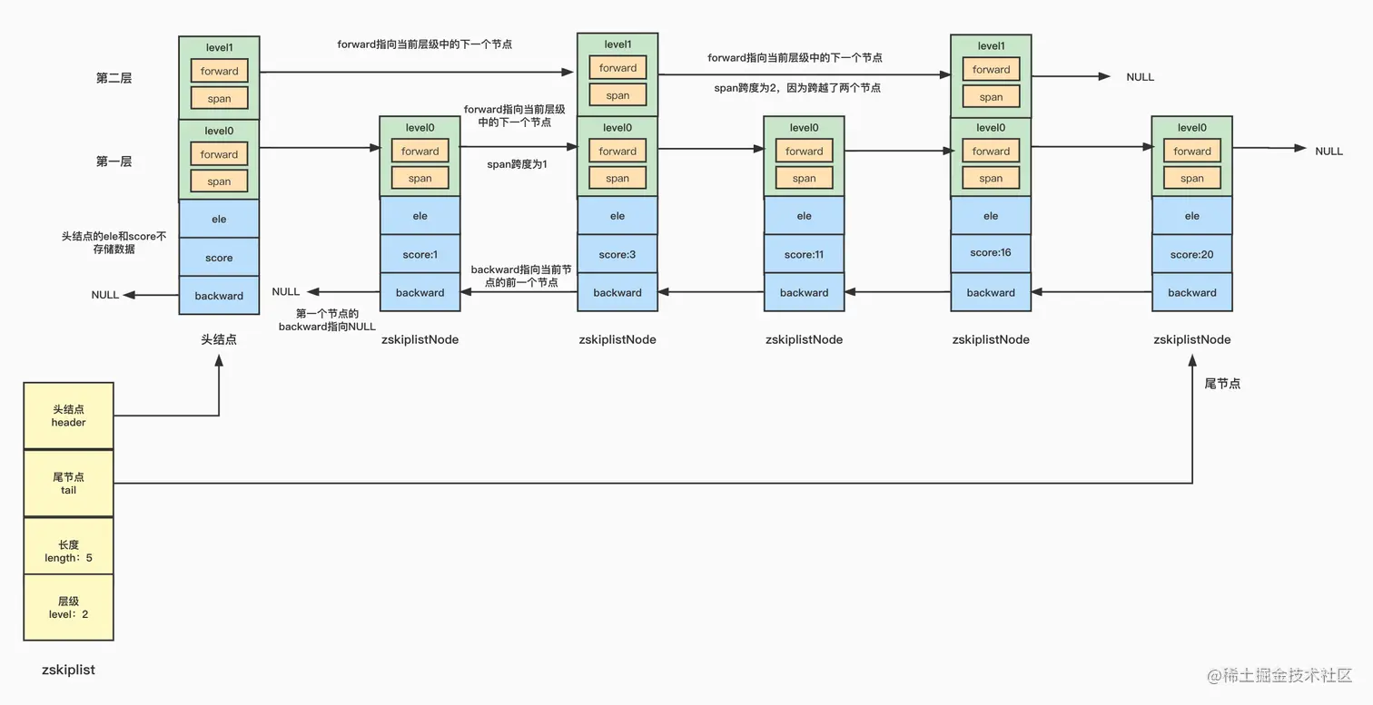 - zskiplistLevel:一个层级数组,因为跳跃表可以有多层,每一层中都有一个指向当前层级中的下一个节点的指针forward和span跨度,跨度代表了当前层级里面,当前节点与下一个节点直接跨越了几个节点