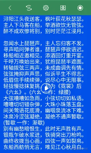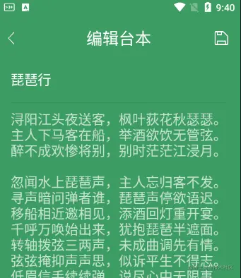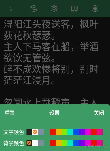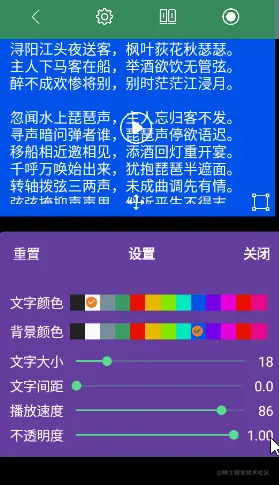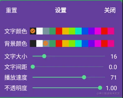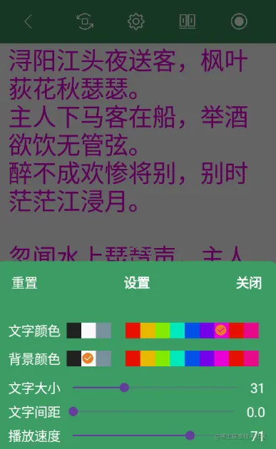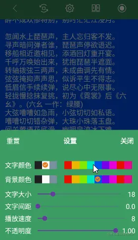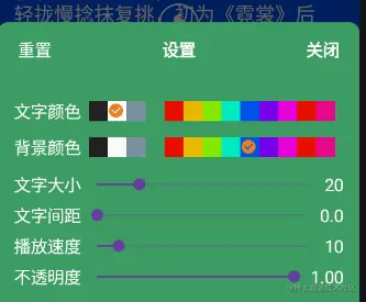 - 修改的界面属性有:文字颜色, 背景色, 文字大小, 文字间距, 播放速度, 透明度
