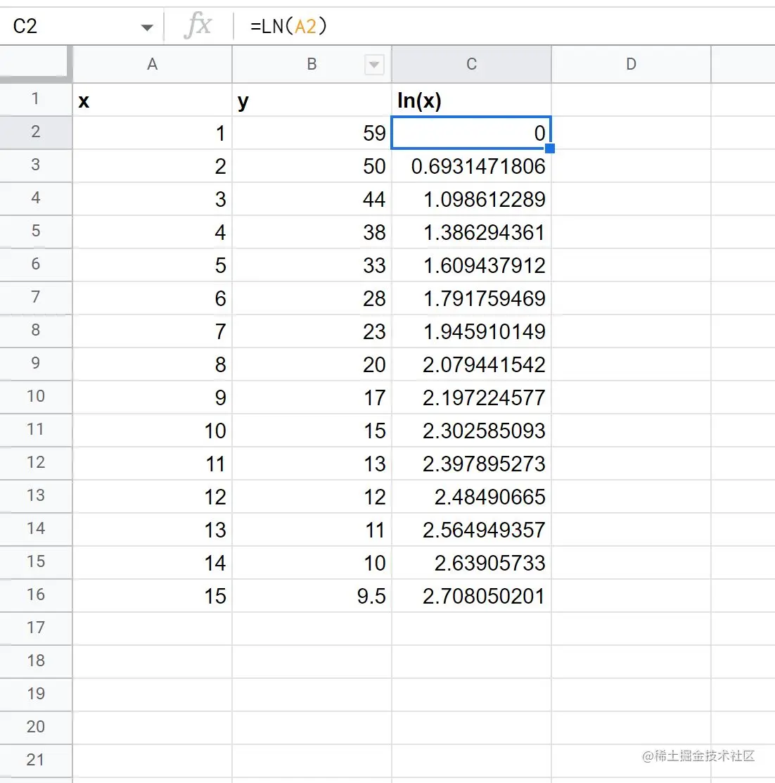 接下来,我们需要创建一个新列,代表预测变量x的自然对数: