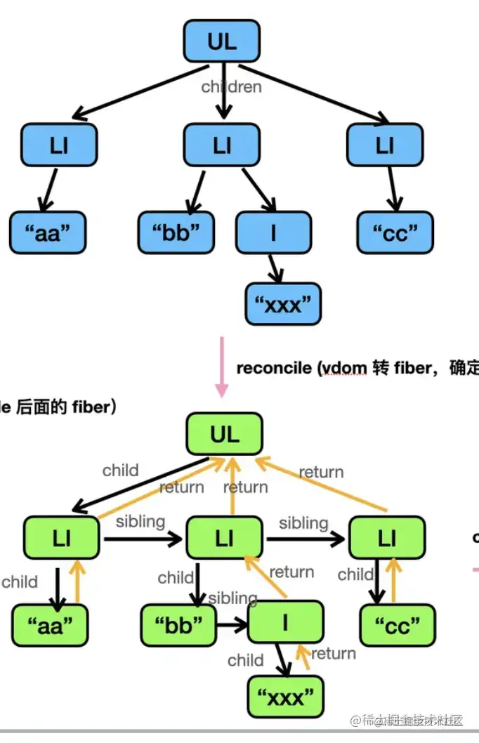 所以 fiber 既指这种链表的数据结构,又指这个 render、commit 的流程。