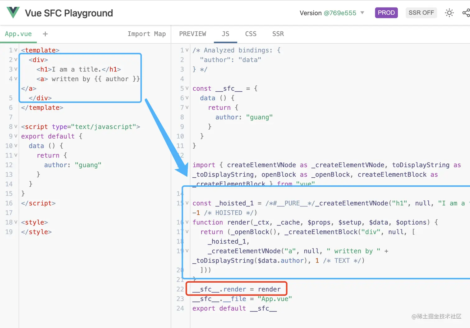 大家可能平时会写单文件组件 sfc 的形式,那个会有专门的编译器,把 template 编译成 render function,然后挂到 option 对象的 render 方法上: