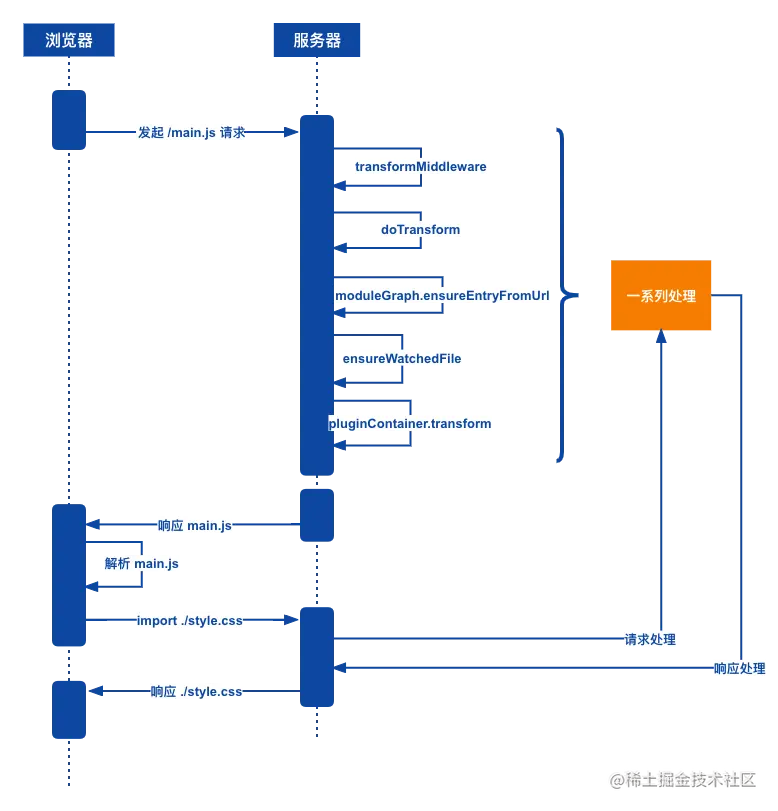 - 浏览器拿到 main.js 的响应后,解析过程中遇到 import 就会接着发起资源请求,就又会进入 transformMiddleware 重复上述流程,一层一层地完成整个应用的资源加载,这里就利用浏览器支持 ESM 的设计。