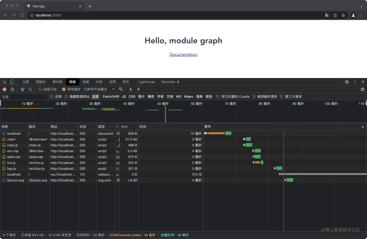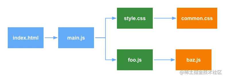 上述代码,根目录 index.html 加载 main.js。main.js 引用了 style.css 的样式文件,style.css 通过 @import 引入 common.css; main.js 同时还引用了 foo.js,.src/foo 引入了 sayHello、name;在文件 ./src/foo.js 中通过 export * from './baz' 导出了 sayHello 方法。文件之间的关系就如下图所示: