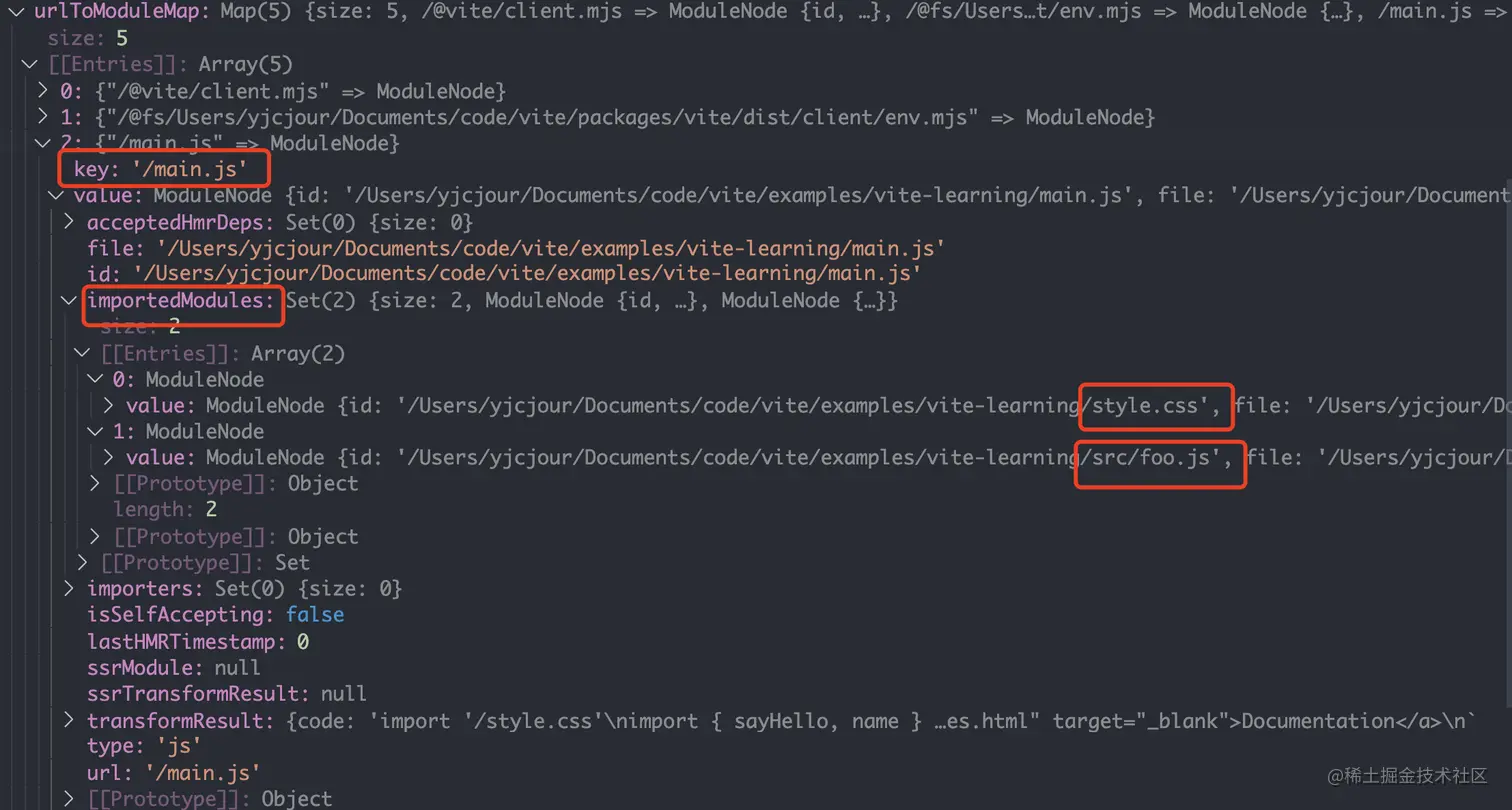 那么 style.css 、foo.js 是怎么添加到 moduleGraph 中的呢?答案就是通过内置插件 vite:import-analysis ,在该插件的 transform 钩子中,会进行 import 的静态分析,如果有引用其他资源,那么也会添加到 moduleGraph 中。importAnalysis 源码会放到插件篇单独展开分析。但是我们可以看下 /main.js 经过 transform 钩子之后 moduleGraph 的结果: