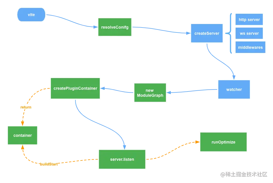 从全流程上看,我们在解析完配置后,就会创建服务器(createServer)、初始化文件监听器(watcher),这两个过程在 敲下命令后,Vite 做了哪些事? 简述过,细节部分比较少,所以不会用单独的篇幅去展开讲。所以接着就会通过 new ModuleGraph 去创建模块图。
