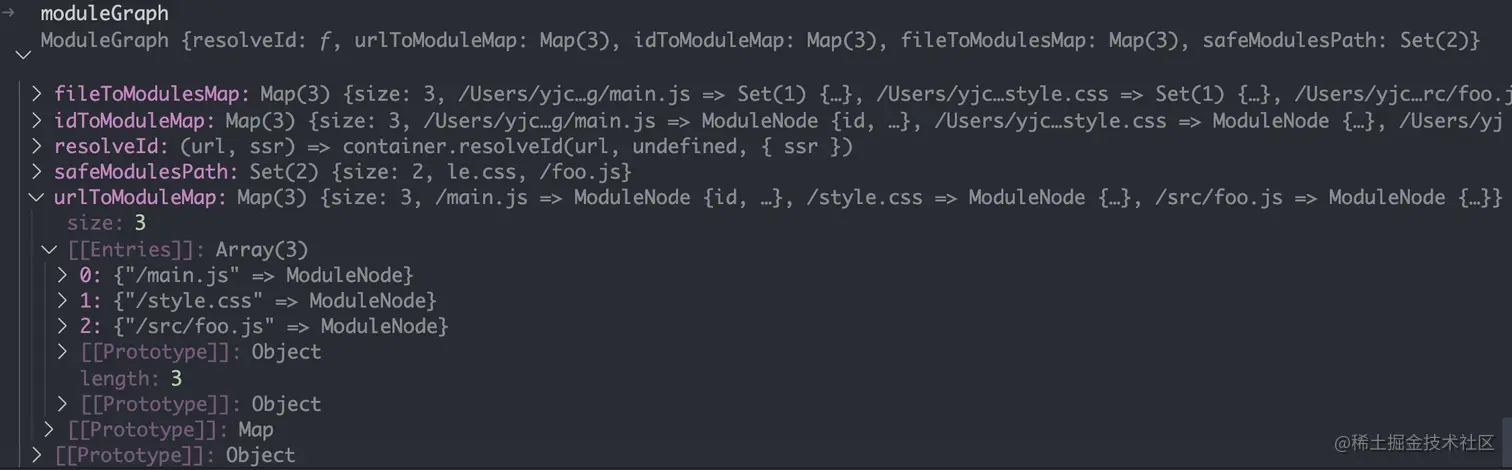在 ModuleGraph 类中我们已经了解 ensureEntryFromUrl 是将 url 解析后创建 ModuleNode 实例,并存到 urlToModuleMap、idToModuleMap、fileToModulesMap,最后返回的 mod 信息如下: