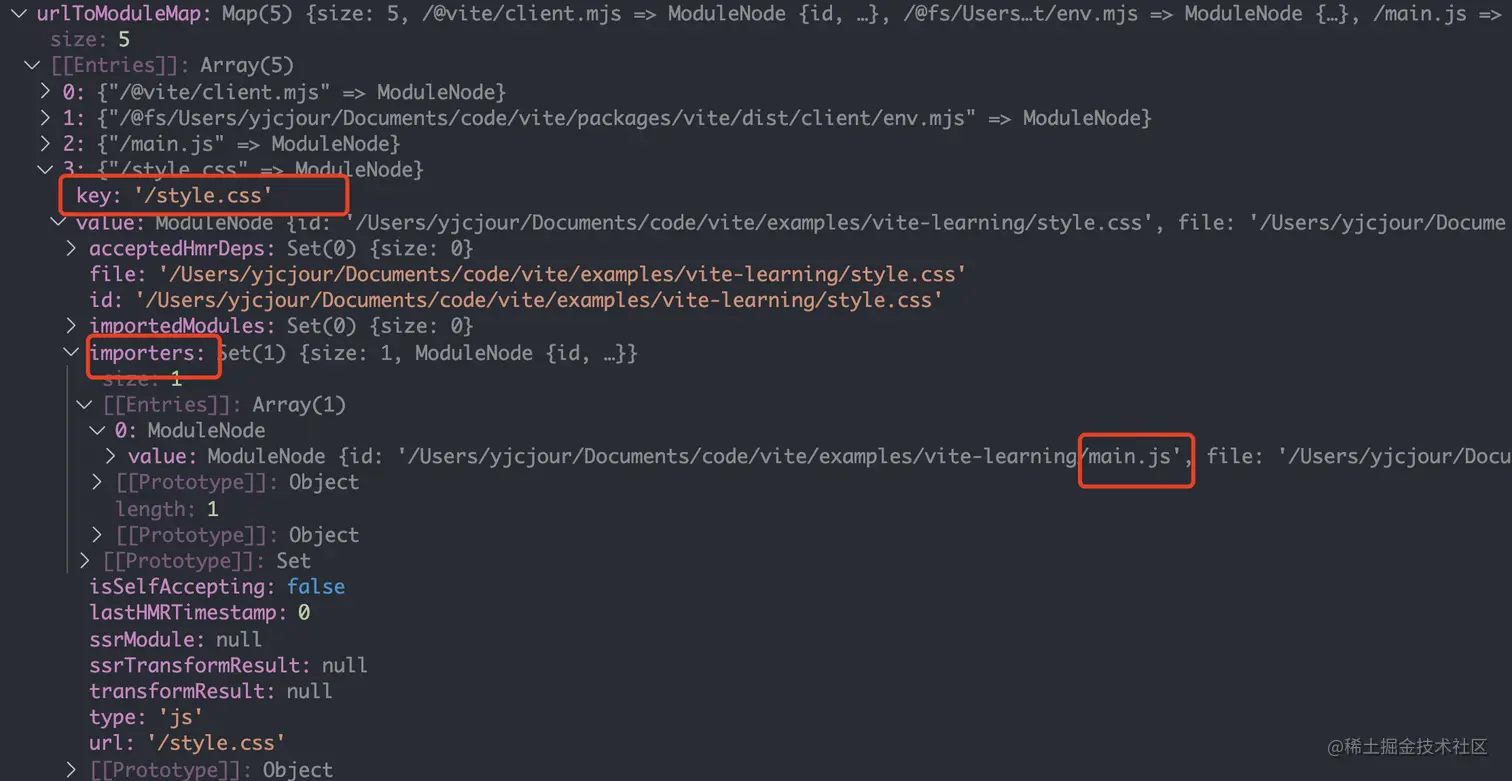 main.js 模块通过 importedModules 关联了两个子模块(style.css、foo.js)的信息,style 模块通过 importers 关联了父模块(main.js)的信息。