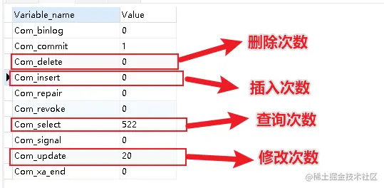 MySQL 客户端连接成功后,通过 show [session|global] status命令可以提供服务器状态信息。查看当前数据库的 INSERT、UPDATE、DELETE、SELECT的访问频次;