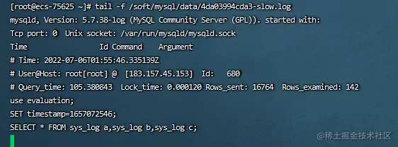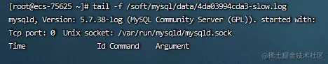 配置完毕之后,通过以下指令重新启动MySQL服务器进行测试,查看慢日志文件中记录的信息