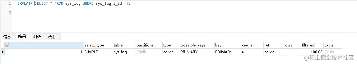 | filtered | 表示返回结果的行数占需读取行数的百分比, filtered 的值越大越好。 |