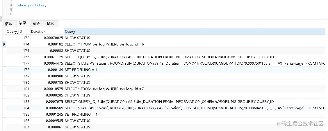 开启后我们可以随便执行些增删改查的语句,然后通过以下的命令查看指令的执行情况: