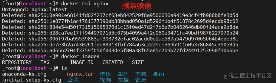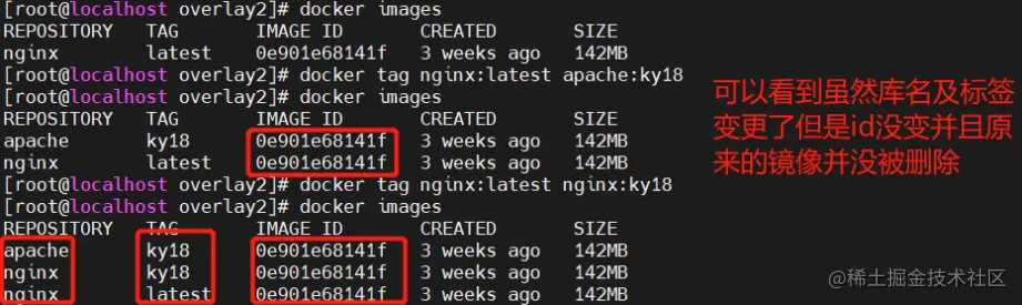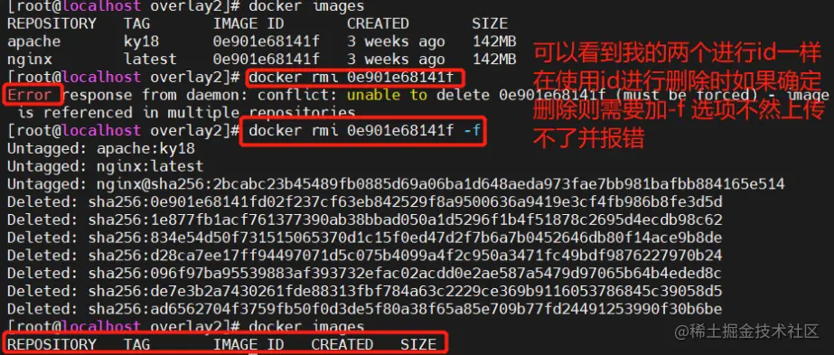 若镜像ID有多个标签,需要加上-f(强制删除)才可以删除