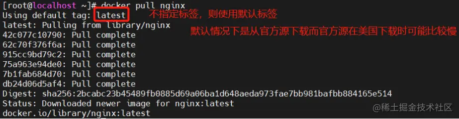 #如果下载镜像时不指定标签,则默认会下载仓库中最新版本的镜像,即选择标签为latest标签。