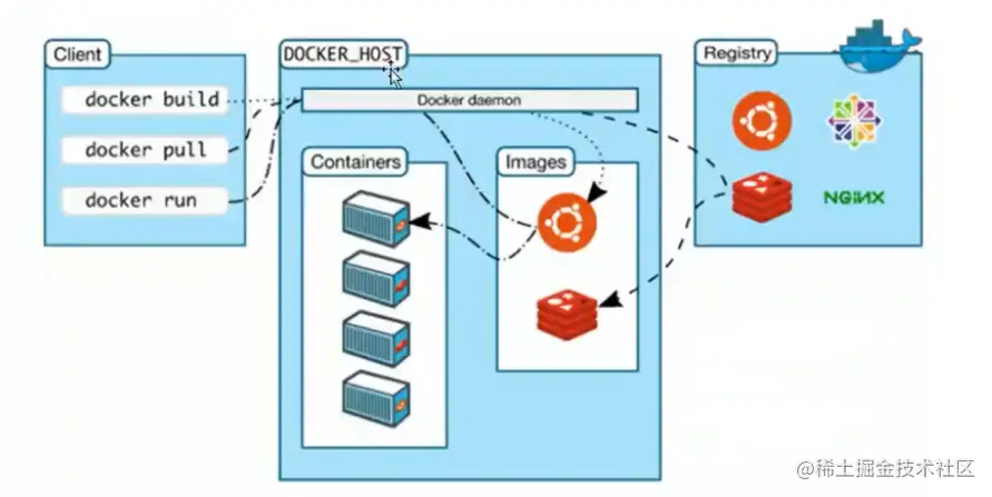 - 首先客户端(client)将指令发送给服务端(Docker daemon)服务端会根据指令的需求先查询本地(lmages)是否有相关的镜像如果有则直接运行成相关的容器(containers),如果没有则去仓库(registry)中拉取相关的镜像到本地(lmages)运行成相关的容器(containers)