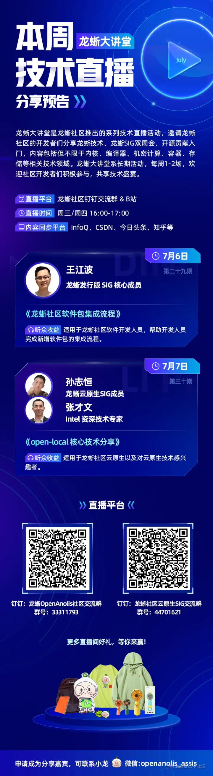 「龙蜥大讲堂」第 29-30 期来啦!今、明天 SIG 双周会直播将继续邀请大咖在线分享,来自龙蜥社区发行版 SIG 核心成员分享《龙蜥社区软件包集成流程》、龙蜥社区云原生 SIG 核心成员、Intel 资深技术专家分享《CSI 与 open-local 核心技术分享》,快来扫码入群,预定前排小板凳观看直播吧!