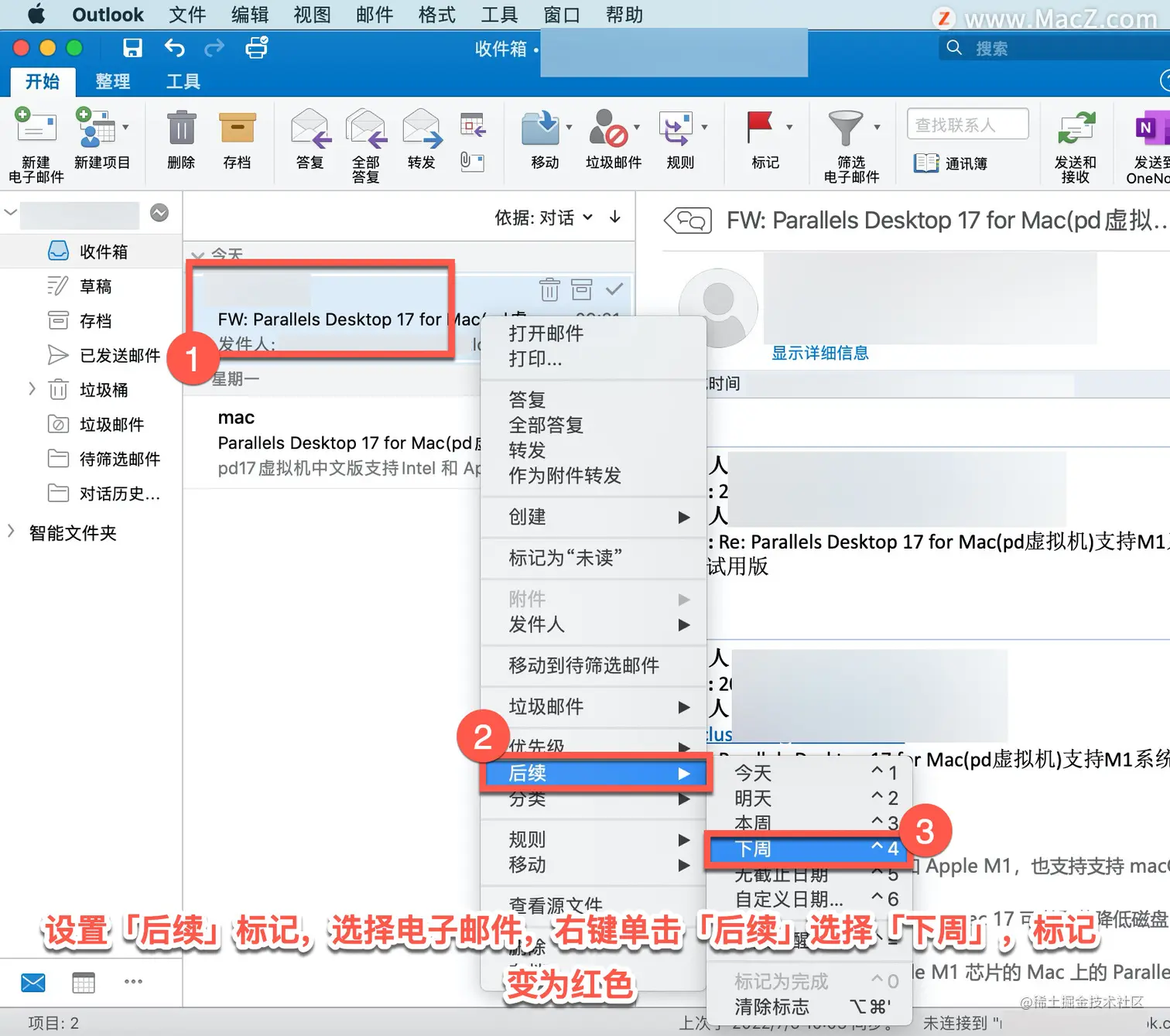 设置「后续」标记,选择电子邮件,右键单击「后续」选择「下周」,标记变为红色,该电子邮件的标题中将显示一条「后续」标志消息。