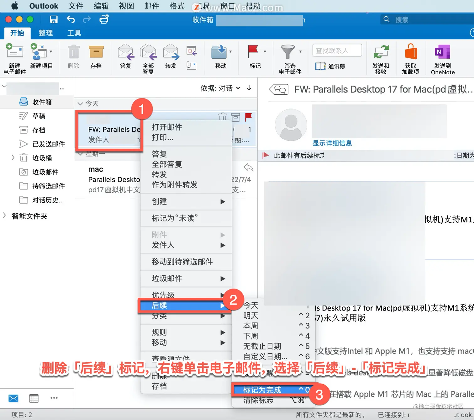 删除「后续」标记,右键单击电子邮件,选择「后续」-「标记完成」。
