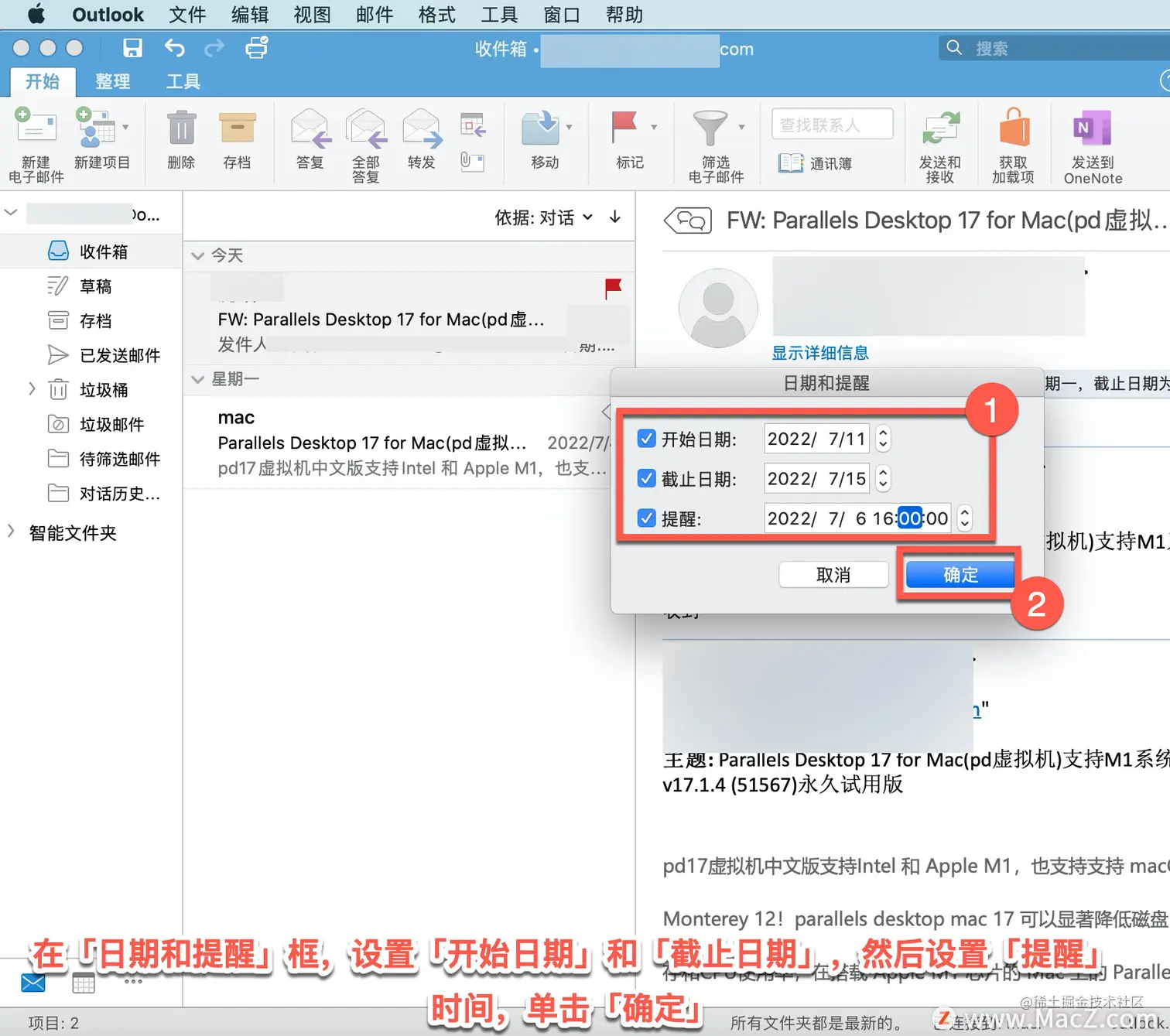 在「日期和提醒」框,设置「开始日期」和「截止日期」,然后设置「提醒」时间,单击「确定」。