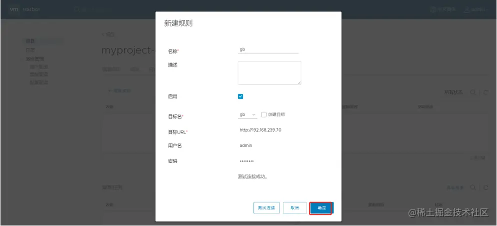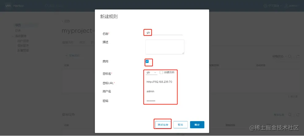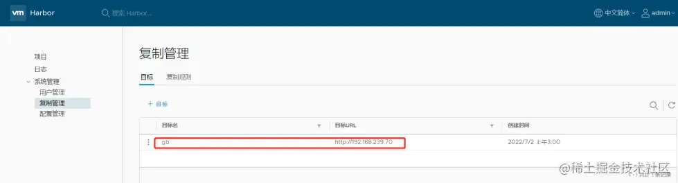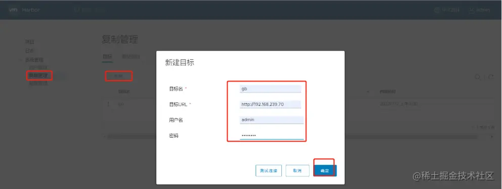 60切换用户admin-> 复制管理 -> +目标 -> 目标名称gb -> 目标URLhttp://192.168.239.70 -> 用户名密码admin/Harbor -> 确定