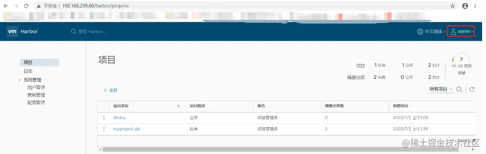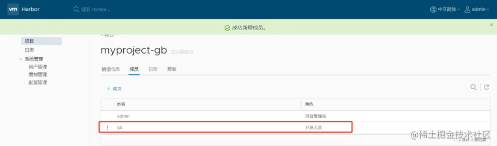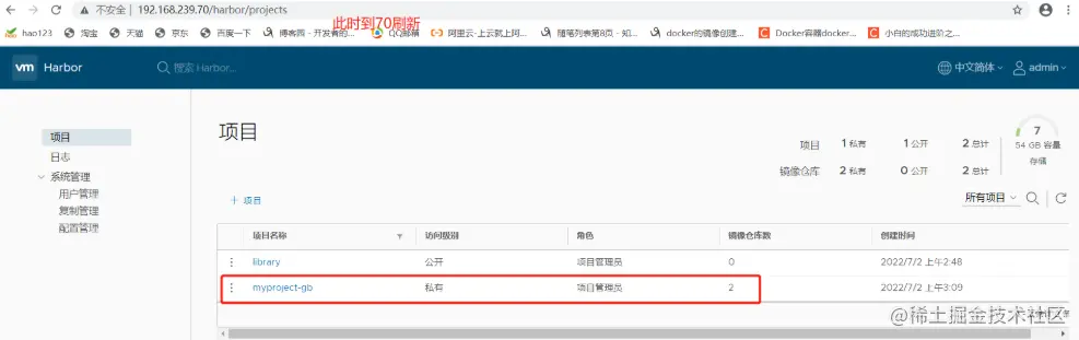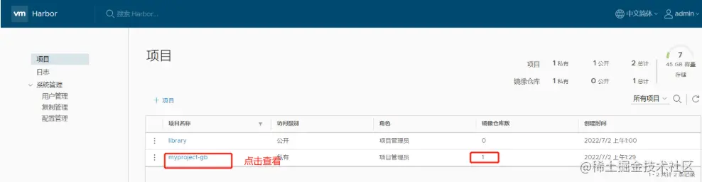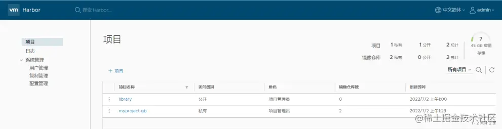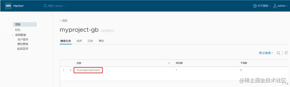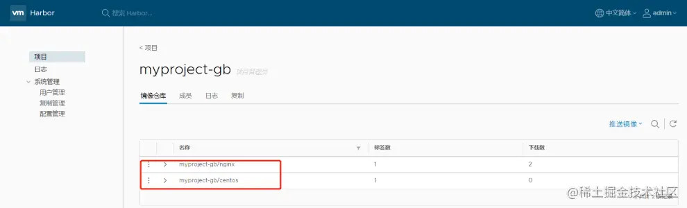 刷新 Harbor 的 Web 管理界面进行查看,会发现 myproject-gb 项目里面有两个镜像