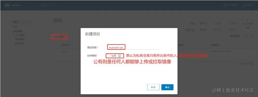 在 Harbor 仓库中,任何镜像在被 push 到 regsitry 之前都必须有一个自己所属的项目。