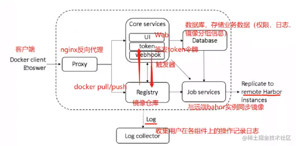 Harbor 在架构上主要有 Proxy、Registry、Core services、Database(Harbor-db)、Log collector(Harbor-log)、Job services 六个组件。