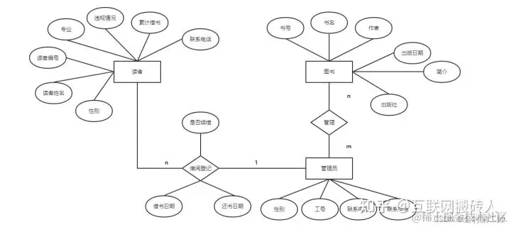 连线:用线段分别与有关实体相连接,并在线段上标注上联系的类型(1:1、1:n或m:n)。两个不同实体之间之间的联系可分为一对一联系记为1:1,一对多联系记为1:n,多对多联系记为m:n。比如一个管理员能同时登记多个读者,一个读者某个时间内只能被一个管理员登记,关系即为(1:n)。