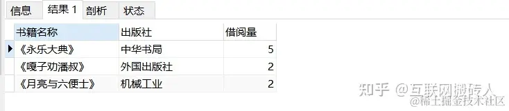(7) 查询被借阅最多的前三本书籍,要求输出书籍名称,出版社,借阅量并按借阅量降序排列
