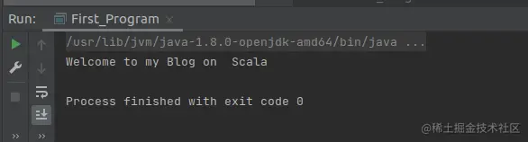 在上面的代码中,我们创建了First_Program这个对象。这是一个简单的程序,它的输出是欢迎来到我的Scala博客。