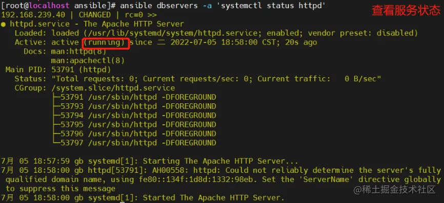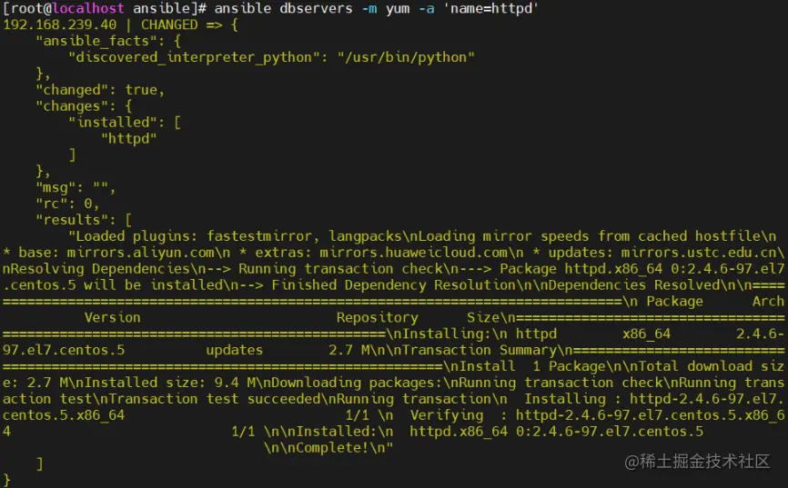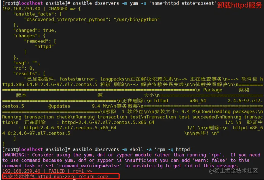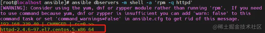 ansible dbservers -m shell -a 'rpm -q httpd' #验证服务是否安装