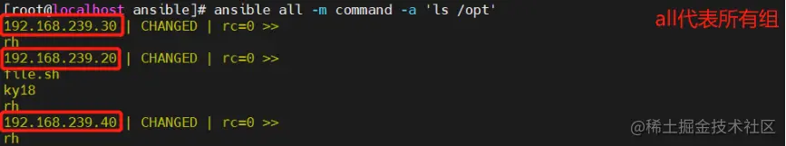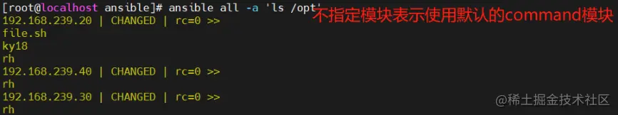 ansible all -a 'ls /opt' #如省略 -m 模块,则代表为默认的 command 模块