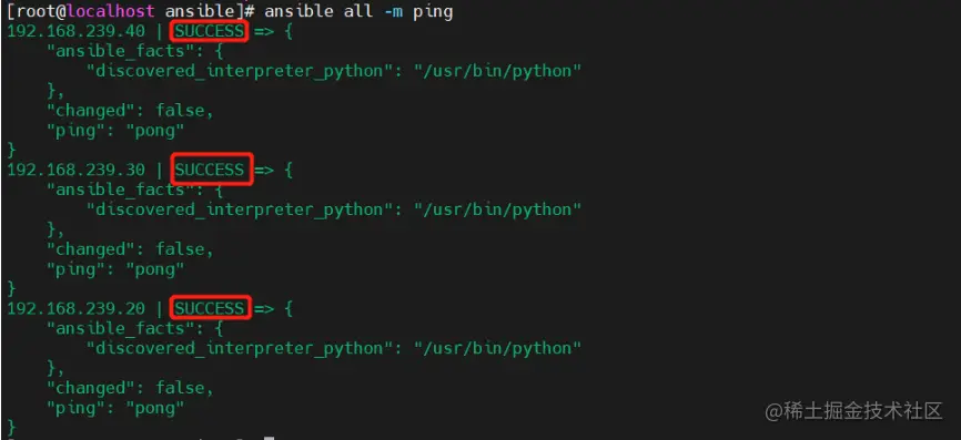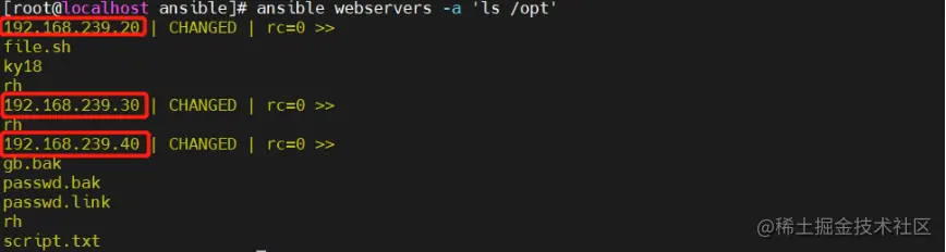 ansible 192.168.239.30 -m command -a 'ls /opt' #指定ip执行 ls /opt 命令