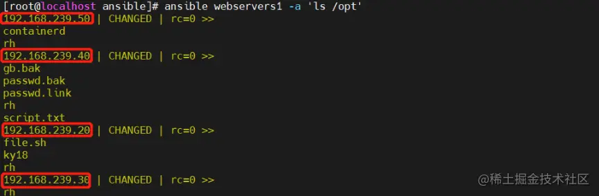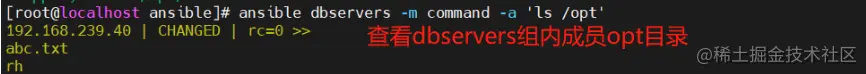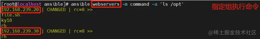 ansible webservers -m command -a 'ls /opt' #指定组执行 ls /opt 命令