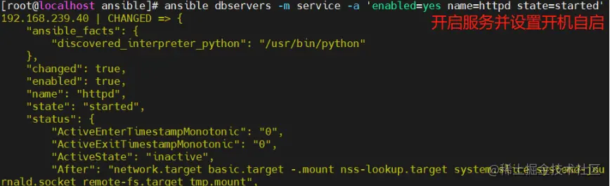 ansible dbservers -m service -a 'enabled=yes name=httpd state=started'