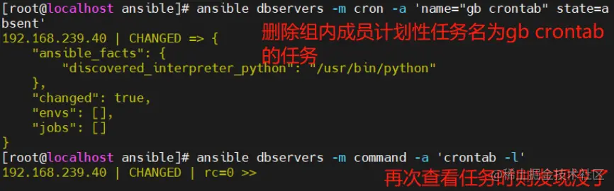 ansible dbservers -m cron -a 'name="gb crontab" state=absent'