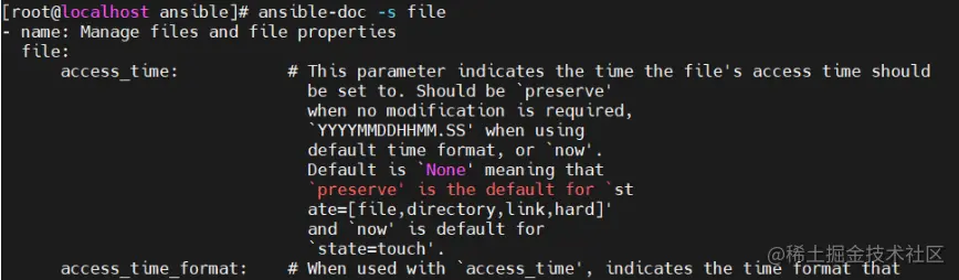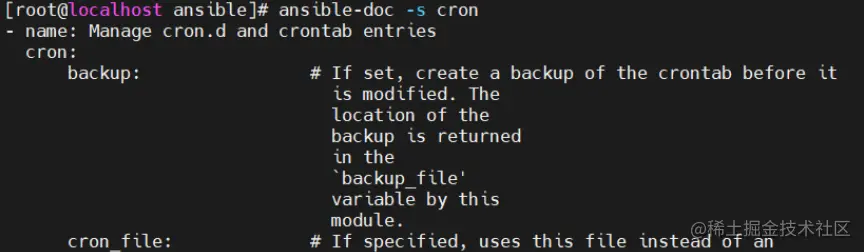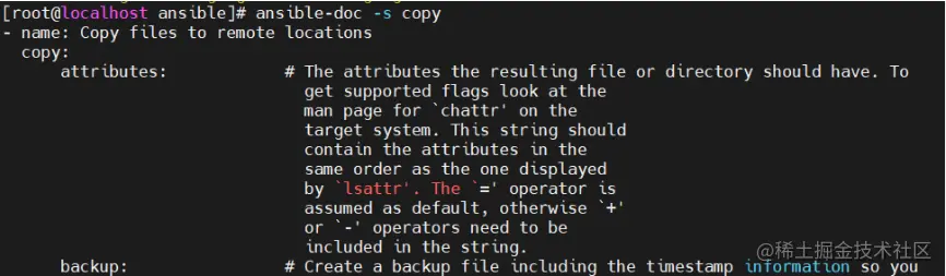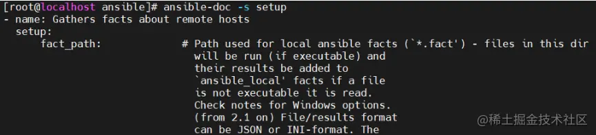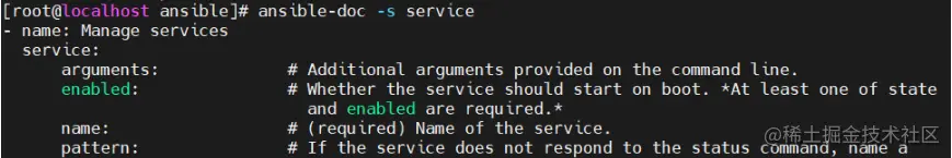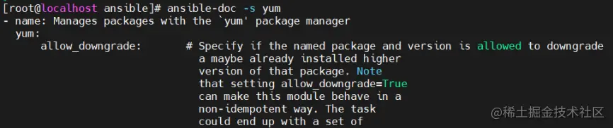ansible-doc -s command #-s 列出指定模块的描述信息和操作动作