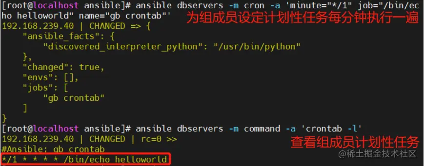 ansible dbservers -m cron -a 'minute="*/1" job="/bin/echo helloworld" name="gb crontab"'