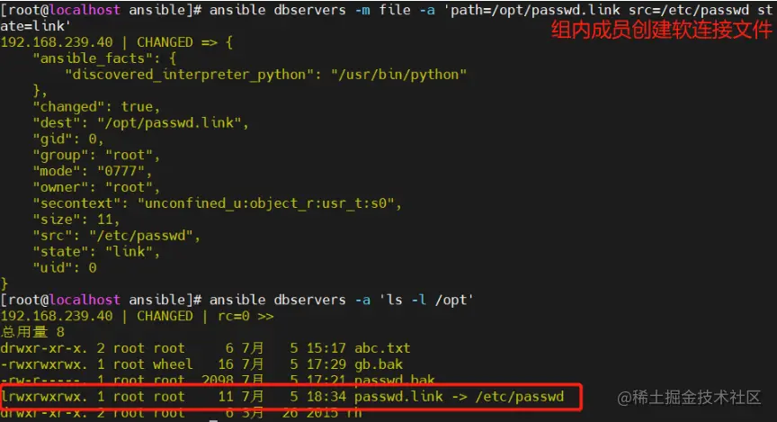 ansible dbservers -m file -a 'path=/opt/passwd.link src=/etc/passwd state=link'