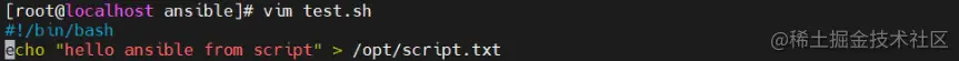 echo "hello ansible from script" > /opt/script.txt #在script.txt中写入指定内容