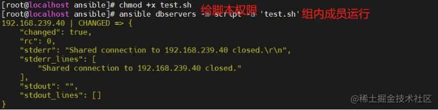 ansible dbservers -m script -a 'test.sh' #实现远程运行本地的脚本